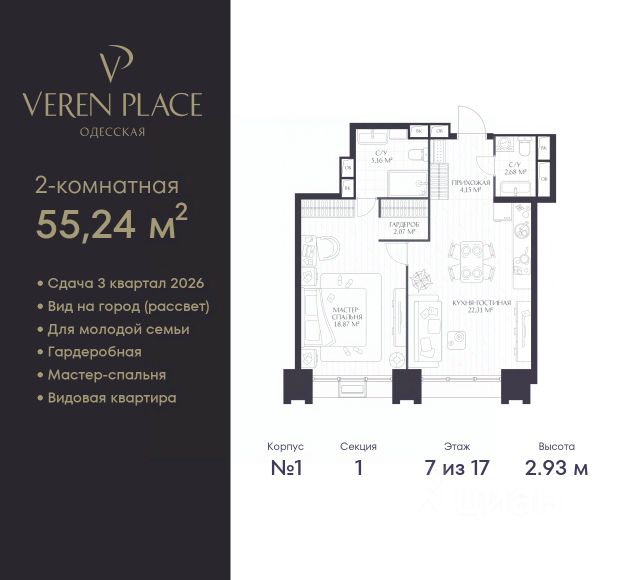 Продается 1-комн. квартира на 7-м этаже в строящемся проекте премиум-класса GloraX Premium Черниговская. Общая площадь лота составляет 48,80 кв. м, из которых 14,95 кв. м отведено под жилую и 21,19 кв. м под кухонную зону. Номер квартиры - 293.
