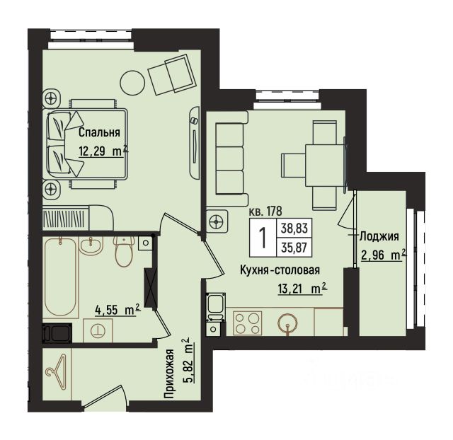 1-комнатная квартира евроформата (37,8 кв.м.) в ЖК "2Д Федосеенко" в Сормовском районе Нижнего Новгорода.