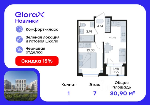 Продается 1-комн. квартира на 7-м этаже в строящемся проекте комфорт-класса GloraX Новинки. Общая площадь лота составляет 30,04 кв. м, из которых 10,47 кв. м отведено под жилую и 12,80 кв. м под кухонную зону. Номер квартиры - 689. Преимущества квартиры: компактная 1 к.кв.; лоджия - Внедрение лучших практик строительства - Уникальное благоустройство, пешеходные аллеи и продуманные площадки (для релакса, спорта и игр с детьми) - Собственная коммерческая инфраструктура и комьюнити-центр для жителей - Безопасность на всех уровнях: закрытый двор, видеонаблюдение и система "Умный Дом" - Безбарьерная среда - Дизайнерские остекленные холлы - Просторные колясочные в каждой секции - Современные системы вентиляции, места для кондиционеров - Эргономичные квартиры с евро-планировками - Чистовая отделка квартир в 2 стилях на выбор и с дополнительной опцией покраски стен в 4 трендовых цвета на выбор: агатовый серый, серебристо-серый, серый шелк и тонкий лен. - Зеленая зона в шаговой доступности, заповедник регионального значения "Малиновая Гряда" и спортивная деревня Новинки GloraX Новинки - это современный масштабный проект в Нижнем Новгороде, который расположился у южной границы города по правому берегу Оки рядом с поселком Новинки в Приокском районе города. GloraX Новинки это проект с уникальным благоустройством, полной инфраструктурой для жизни и выгодными ценами на квартиры комфорт-класса. Близость к зеленым зонам реки, спортивной деревни Новинки и непосредственной черте города - идеальное место для тех кто любит природу, но не готов отказываться от благ современной инфраструктуры. GloraX Новинки надежно связан с другими районами Нижнего и популярными загородными направлениями такими как Павловское и Арзамасское направления, проспект Гагарина, а также ж/д станцией Окский берег и аэропортом Стригино. До главной парковой зоны города, парка "Швейцария" всего 15 минут на машине, а до Кремля и Чкаловской лестницы - 40 мин. В GloraX Новинки доступен широкий выбор планировочных решений от небольших уютных студий площадью 20 м2 до трехкомнатных квартир площадью до 72 м2 с просторными остекленными лоджиями. Получить ключи и сразу переехать? Легко! Все квартиры в проекте сдаются в чистовой отделке в двух стилях: в светлом и темном. Отдельной опцией можно даже дозаказать покраску стен в 4 трендовых цветах на выбор: агатовый серый, серебристо-серый, серый шелк и тонкий лен. Цена указана при 100% оплате или стандартной ипотеке. Узнайте подробности в Отделе продаж. Продается 1-комнатная квартира рядом с метро Комсомольская.