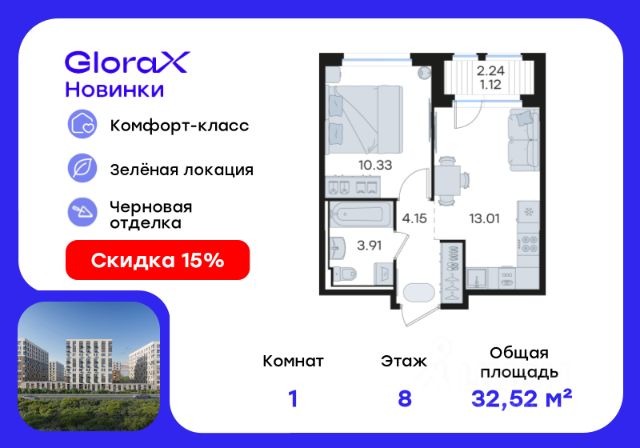 Продается 1-комн. квартира на 7-м этаже в строящемся проекте комфорт-класса GloraX Новинки. Общая площадь лота составляет 30,04 кв. м, из которых 10,47 кв. м отведено под жилую и 12,80 кв. м под кухонную зону. Номер квартиры - 689. Преимущества квартиры: - Внедрение лучших практик строительства - Уникальное благоустройство, пешеходные аллеи и продуманные площадки (для релакса, спорта и игр с детьми) - Собственная коммерческая инфраструктура и комьюнити-центр для жителей - Безопасность на всех уровнях: закрытый двор, видеонаблюдение и система "Умный Дом" - Безбарьерная среда - Дизайнерские остекленные холлы - Просторные колясочные в каждой секции - Современные системы вентиляции, места для кондиционеров - Эргономичные квартиры с евро-планировками - Чистовая отделка квартир в 2 стилях на выбор и с дополнительной опцией покраски стен в 4 трендовых цвета на выбор: агатовый серый, серебристо-серый, серый шелк и тонкий лен. - Зеленая зона в шаговой доступности, заповедник регионального значения "Малиновая Гряда" и спортивная деревня Новинки GloraX Новинки - это современный масштабный проект в Нижнем Новгороде, который расположился у южной границы города по правому берегу Оки рядом с поселком Новинки в Приокском районе города. GloraX Новинки это проект с уникальным благоустройством, полной инфраструктурой для жизни и выгодными ценами на квартиры комфорт-класса. Близость к зеленым зонам реки, спортивной деревни Новинки и непосредственной черте города - идеальное место для тех кто любит природу, но не готов отказываться от благ современной инфраструктуры. GloraX Новинки надежно связан с другими районами Нижнего и популярными загородными направлениями такими как Павловское и Арзамасское направления, проспект Гагарина, а также ж/д станцией Окский берег и аэропортом Стригино. До главной парковой зоны города, парка "Швейцария" всего 15 минут на машине, а до Кремля и Чкаловской лестницы - 40 мин. В GloraX Новинки доступен широкий выбор планировочных решений от небольших уютных студий площадью 20 м2 до трехкомнатных квартир площадью до 72 м2 с просторными остекленными лоджиями. Получить ключи и сразу переехать? Легко! Все квартиры в проекте сдаются в чистовой отделке в двух стилях: в светлом и темном. Отдельной опцией можно даже дозаказать покраску стен в 4 трендовых цветах на выбор: агатовый серый, серебристо-серый, серый шелк и тонкий лен. Цена указана при 100% оплате или стандартной ипотеке. Узнайте подробности в Отделе продаж.