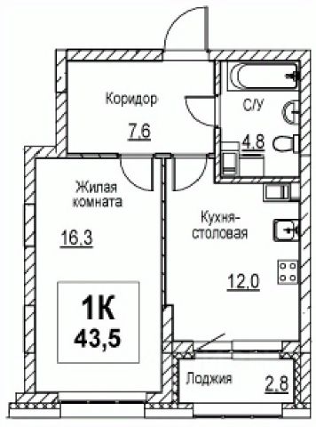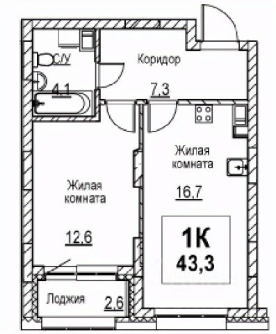 Продаётся 1-комнатная квартира в строящемся доме (Корпус 1), срок сдачи: I-кв. 2028, общей площадью 43.3 кв.м., на 6 этаже.