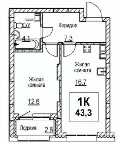 Продаётся 1-комнатная квартира в строящемся доме (Корпус 1), срок сдачи: I-кв. 2028, общей площадью 43.3 кв.м., на 7 этаже.