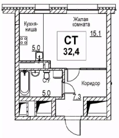 Продаётся 1-комнатная квартира в строящемся доме (Корпус 1), срок сдачи: I-кв. 2028, общей площадью 32.4 кв.м., на 3 этаже.
