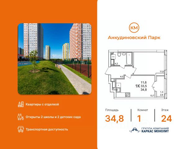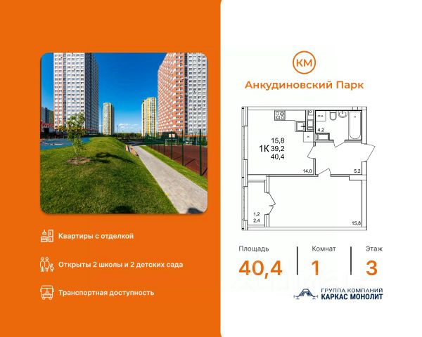 Продается квартира в строящемся доме с новой улучшенной отделкой под ключ. Ванная комната подвесная раковина с тумбой белоснежная акриловая ванна электрический полотенцесушитель удобный унитаз-компакт стены — бежевая плитка, пол — керамогранит под мрамор споты на потолке Кухня светлый кухонный гарнитур встроенные духовой шкаф и варочная панель раковина и смеситель уже установлены На полу ламинат 32 класса Комнаты белые обои под покраску — легко освежить интерьер в любом стиле надёжный ламинат 32 класса на полу шпонированные межкомнатные двери Прихожая износостойкий керамогранит под мрамор, который всегда выглядит аккуратно и стильно. КМ Анкудиновский Парк — современный жилой комплекс, который уже стал полноценным районом для жизни. Здесь не нужно ждать, пока появится инфраструктура — всё уже есть и работает! Открыты 2 детских сада на 150 и 280 мест, 2 школы на 1350 местСетевые магазины, кафе и различные сервисыИгровые и спортивные площадки для детей и взрослыхПроектом предусмотрено строительство третьего детского сада, а также торгового центра, поликлиники и ФОКаОбщественный транспорт: несколько действующих маршрутов, на которых удобно добираться в разные части города Станьте жителем КМ Анкудиновский Парк и вы! Посетите наш шоурум и узнайте больше о выгодных предложениях и вариантах покупки в офисе продаж группы компаний Каркас Монолит.