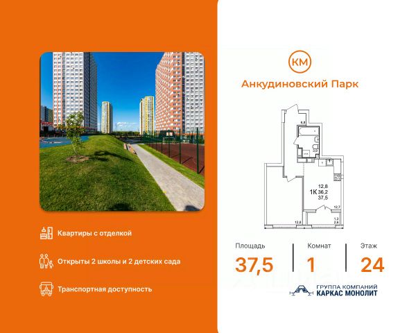 Продается квартира в КМ Анкудиновский Парк с новой улучшенной отделкой. Ванная комната подвесная раковина с тумбой белоснежная акриловая ванна электрический полотенцесушитель удобный унитаз-компакт стены — бежевая плитка, пол — керамогранит под мрамор споты на потолке Кухня светлый кухонный гарнитур встроенные духовой шкаф и варочная панель раковина и смеситель уже установлены На полу ламинат 32 класса Комнаты белые обои под покраску — легко освежить интерьер в любом стиле надёжный ламинат 32 класса на полу шпонированные межкомнатные двери Прихожая износостойкий керамогранит под мрамор, который всегда выглядит аккуратно и стильно. КМ Анкудиновский Парк — современный жилой комплекс, который уже стал полноценным районом для жизни. Здесь не нужно ждать, пока появится инфраструктура — всё уже есть и работает! Открыты 2 детских сада на 150 и 280 мест, 2 школы на 1350 местСетевые магазины, кафе и различные сервисыИгровые и спортивные площадки для детей и взрослыхПроектом предусмотрено строительство третьего детского сада, а также торгового центра, поликлиники и ФОКаОбщественный транспорт: несколько действующих маршрутов, на которых удобно добираться в разные части города Станьте жителем КМ Анкудиновский Парк и вы! Посетите наш шоурум и узнайте больше о выгодных предложениях и вариантах покупки в офисе продаж группы компаний Каркас Монолит.