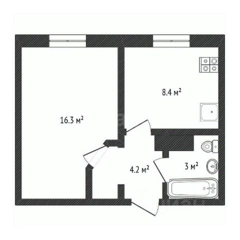 Общая площадь квартиры с учетом лоджии 29,6 кв. м., без учета лоджии 28,5 кв.м., жилая площадь 16,3 кв.м., совмещенный санузел 3,0 кв.м., прихожая 4,2 кв.м, лоджия 1,1 кв.м.