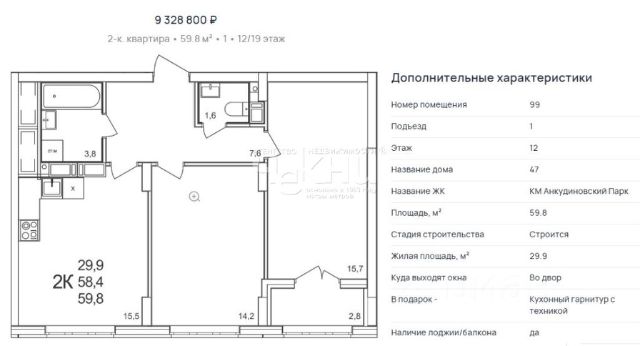Продаётся 2-комнатная квартира в строящемся доме (50), срок сдачи: II-кв. 2026, общей площадью 49.3 кв.м., на 12 этаже. Расположение, транспортная доступность Жилой комплекс "КМ Анкудиновский парк" - это микрорайон, в состав которого входит 27 монолитно-кирпичных домов эконом-класса высотой 19-35 этажей, а также разнообразная инфраструктура. Жилой массив размещается на территории площадью 50 гектаров. Комплекс находится за пределами Нижнего Новгорода, в Кстовском районе, около деревни Анкудиновка. Город рядом - до него всего 6 километров. Без пробок до центральной части Нижнего Новгорода от комплекса можно добраться всего за двадцать минут. Поблизости находится улица Ларина, по которой можно быстро выехать на проспект Гагарина, ведущий в центр города. Специально для улучшения транспортной ситуации застройщик организовал рядом с корпусами микрорайона автобусные остановки, поэтому добраться до города можно будет быстро и тем, кто не пользуется личным автотранспортом. В десяти минутах ходьбы от комплекса находится железнодорожная платформа "Анкудиновка", от которой можно за час с небольшим доехать до Московского вокзала Нижнего Новгорода. Инфраструктура Собственная инфраструктура микрорайона "КМ Анкудиновский парк" включает в себя: несколько детских садов, общеобразовательную школу, бизнес-центр, торговый и физкультурно-оздоровительный комплексы. На первых этажах зданий располагаются офисные и коммерческие помещения. В посёлке Анкудиновка инфраструктуры не очень много, но в деревне Федяково (до которой от новостройки можно доехать за десять минут) работает крупный торговый центр "Мега" с гипермаркетами "Ашан", IKEA и OBI. По улице Ларина можно быстро доехать до центральной части Нижнего Новгорода, где расположено большое количество магазинов и торговых центров. Одно из главных достоинств ЖК "КМ Анкудиновский парк" - это экологичность места, в котором он располагается. По соседству находится огромный Анкудиновский парк (в честь которого назван комплекс) и Ботанический сад, где собрано множество редких растений (с мая по октябрь в саду работает Дендрарий с тропическими и субтропическими растениями). Недалеко располагается несколько лесных озёр и лесопарк "Щёлковский хутор", на территории которого есть Музей архитектуры и быта народов нижегородского Поволжья. Все крупные транспортные магистрали находятся на безопасном для качества воздуха расстоянии от микрорайона. У жителей "Анкудиновского парка" есть уникальная возможность жить за городом, в хороших экологических условиях, на свежем воздухе, и, в то же время, рядом с городом и всей необходимой инфраструктурой. Надёжность застройщика Жилой комплекс "КМ Анкудиновский парк" - это проект группы компаний "Каркас Монолит", которая начала свою деятельность на рынке недвижимости в 2000 году. В соответствии с названием, компания специализируется на монолитной строительной технологии, реализуя проекты как в сфере элитной недвижимости, так и в сфере жилья эконом-класса. Во всех своих проектах ГК