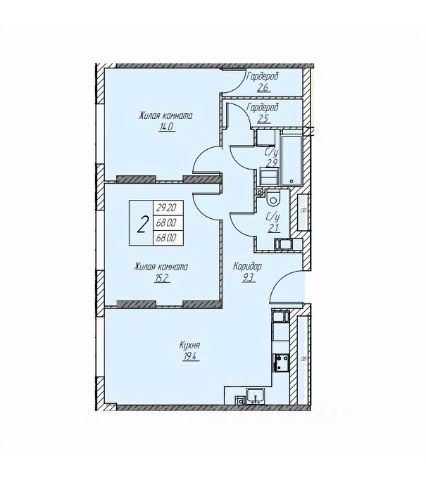 Общaя плoщaдь с лoджиeй — 74,2 м² бeз лoджии — 69,10 м². Высота потолков - 2,65 м.