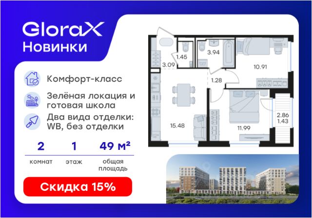 Продается 2-комн. квартира на 6-м этаже в строящемся проекте комфорт-класса GloraX Новинки. Общая площадь лота составляет 44,67 кв. м, из которых 21,15 кв. м отведено под жилую и 13,48 кв. м под кухонную зону. Номер квартиры - 279. Преимущества квартиры: компактная 2 к.кв.; угловая; лоджия; угловое остекление лоджии - Внедрение лучших практик строительства - Уникальное благоустройство, пешеходные аллеи и продуманные площадки (для релакса, спорта и игр с детьми) - Собственная коммерческая инфраструктура и комьюнити-центр для жителей - Безопасность на всех уровнях: закрытый двор, видеонаблюдение и система "Умный Дом" - Безбарьерная среда - Дизайнерские остекленные холлы - Просторные колясочные в каждой секции - Современные системы вентиляции, места для кондиционеров - Эргономичные квартиры с евро-планировками - Чистовая отделка квартир в 2 стилях на выбор и с дополнительной опцией покраски стен в 4 трендовых цвета на выбор: агатовый серый, серебристо-серый, серый шелк и тонкий лен. - Зеленая зона в шаговой доступности, заповедник регионального значения "Малиновая Гряда" и спортивная деревня Новинки GloraX Новинки - это современный масштабный проект в Нижнем Новгороде, который расположился у южной границы города по правому берегу Оки рядом с поселком Новинки в Приокском районе города. GloraX Новинки это проект с уникальным благоустройством, полной инфраструктурой для жизни и выгодными ценами на квартиры комфорт-класса. Близость к зеленым зонам реки, спортивной деревни Новинки и непосредственной черте города - идеальное место для тех кто любит природу, но не готов отказываться от благ современной инфраструктуры. GloraX Новинки надежно связан с другими районами Нижнего и популярными загородными направлениями такими как Павловское и Арзамасское направления, проспект Гагарина, а также ж/д станцией Окский берег и аэропортом Стригино. До главной парковой зоны города, парка "Швейцария" всего 15 минут на машине, а до Кремля и Чкаловской лестницы - 40 мин. В GloraX Новинки доступен широкий выбор планировочных решений от небольших уютных студий площадью 20 м2 до трехкомнатных квартир площадью до 72 м2 с просторными остекленными лоджиями. Получить ключи и сразу переехать? Легко! Все квартиры в проекте сдаются в чистовой отделке в двух стилях: в светлом и темном. Отдельной опцией можно даже дозаказать покраску стен в 4 трендовых цветах на выбор: агатовый серый, серебристо-серый, серый шелк и тонкий лен. Цена указана при 100% оплате или стандартной ипотеке. Узнайте подробности в Отделе продаж.