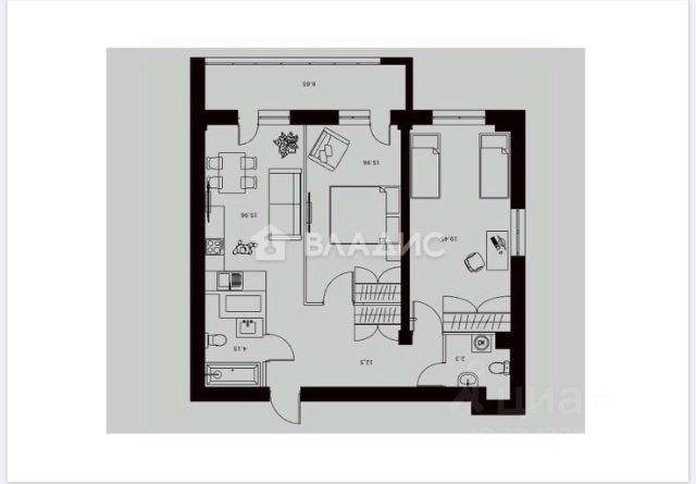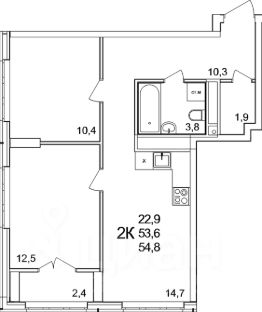 - Просторные жилые комнаты правильной формы: 12,34 и 14,91 кв. м;