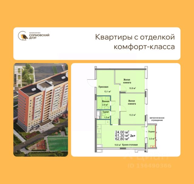 2-комн. квартира от застройщика с отделкой в ЖК "Сормовский дуэт" на 8 этаже. Общая площадь: 71.7 кв.м., жилая: 32 кв.м., площадь просторной кухни-столовой: 19.4 кв.м. Квартира угловая, очень светлая, естественная вентиляция при открытии окон. В квартире один балкон, один совмещенный и один раздельный санузел. Высота потолков 2.65 м. Дом монолитный, двухподъездный, высотой 12 этажей. Квартира находится в 1-й секции в корпусе 1. На этаже 9 квартир. В подъезде 1 пассажирский и 1 грузовой лифт. Окончание строительства - 3 квартал 2026 года. Оформление сделки по договору долевого участия. ЖК "Сормовский дуэт" будет построен в границах улиц Ударная, Достоевского, 8 Марта, в окружении развитой инфраструктуры центра Сормова. Планом застройки предусмотрено 2 дома по 12 этажей. Местоположение. В шаговой доступности излюбленные прогулочные зоны местных жителей скверы имени Рыбакова и Рязанова, бульвар Юбилейный, Сормовский парк, зоопарк, стадион "Труд". Квартира. Отделка комфорт-класса в нейтральных тонах: на полу в жилых комнатах ламинат, в кухне и прихожей керамическая плитка. По всей квартире предусмотрены натяжные потолки. Санузел полностью выложен плиткой, установлены раковины с тумбами и зеркала с подсветкой. МОПы Холлы и подъезды оформлены по авторскому дизайн-проекту с применением износостойких материалов. На первом этаже разместится зона ожидания. Типовые этажи повторяют стиль оформления входной группы первого этажа. Стены лифтовых холлов отделаны износостойким керамогранитом, что позволит сохранить отделку помещений на протяжении длительного времени. Двор. Игровые зоны для детей, зона отдыха для взрослых в окружении зелени. Для любителей активного образа жизни предусмотрена многофункциональная зона воркаута и универсальная спортивная площадка с резиновым покрытием. Безопасность. Огороженная территория и система контроля доступа сделают дворовую территорию не только приватной, но и безопасной. Домофон с распознаванием лиц и бесконтактным доступом. Комплексная система видеонаблюдения за местами общего пользования. #ZmlSzm