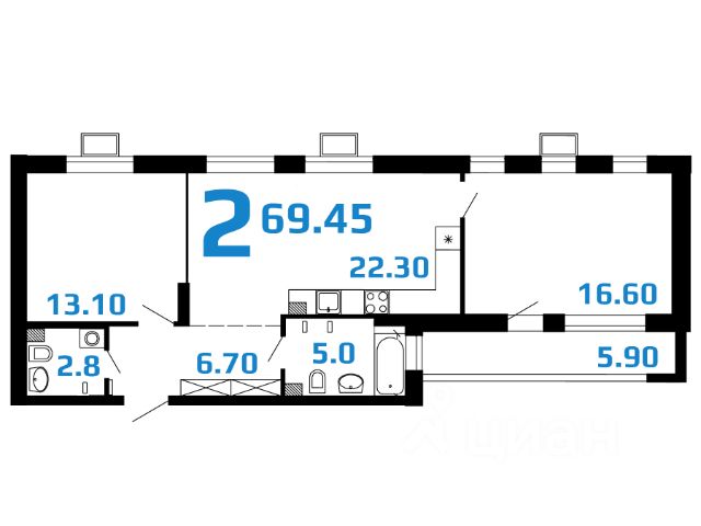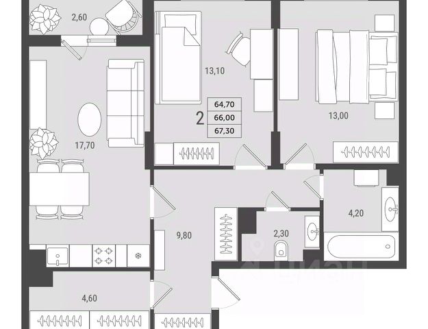 2-комнатная квартира евроформата 63,67 кв.м. в ЖК "2Д Федосеенко". Выделим основные преимущества планировочного решения: