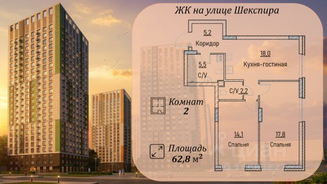 Продается 2-комн. квартира на 5-м этаже в строящемся проекте бизнес-класса Левобережный. Общая площадь лота составляет 62,83 кв. м, из которых 26,75 кв. м отведено под жилую и 16,98 кв. м под кухонную зону. Номер квартиры - 19.
