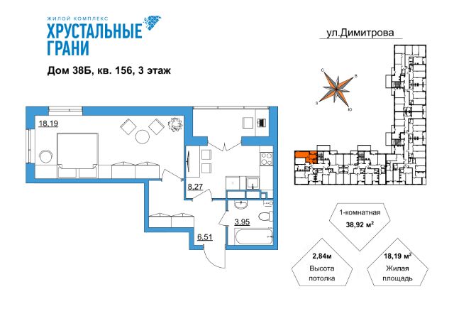 Продаётся 1-комнатная квартира в строящемся доме (Дом 38Б), срок сдачи: IV-кв. 2026, общей площадью 38.92 кв.м., на 3 этаже. Новый жилой комплекс "Хрустальные грани" от застройщика ООО "СЗ Новый век" расположился по адресу: Владимирская область, город Гусь-Хрустальный, улица Димитрова, 38.