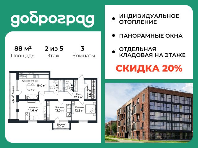 Продается 3-к квартира 88.00 кв.м. в новом построенном доме по адресу: Владимирская область, Доброград, улица Долголетия, д.3, корп. 1. Дом монолитно-блочный, в квартире предусмотрено ИНДИВИДУАЛЬНОЕ ОТОПЛЕНИЕ двухконтурным газовым котлом, что позволяет значительно экономить на коммунальных платежах. Квартира находится на 2 этаже 5-этажного дома. На лестничной площадке предусмотрена собственная КЛАДОВАЯ (келлер) для хранения вещей. В доме есть ЛИФТ, сквозной подъезд с просторной входной группой, большая колясочная. Функциональная планировка, большая кухня-гостиная, эффектная лоджия с ПАНОРАМНЫМ ОСТЕКЛЕНИЕМ, гардеробная помогут грамотно организовать пространство. ДОМ СДАН! Рядом расположен живописный природный парк, озеро, места для отдыха и прогулок, качественные игровые площадки. Доброград - это превосходная экология и современная инфраструктура всего в 2,5 часах от Москвы. В городе работает современный образовательный комплекс "МИР" (частная школа и детский сад), муниципальная гимназия. В 2025 году состоится открытие государственного детского сада и физкультурно-оздоровительного комплекса с бассейном. Медицинское обслуживание обеспечивает Первый клинический медицинский центр, расположенный в 12 километрах от Доброграда, а в самом Доброграде работает кабинет врача общей практики. Территория охраняется, въезд строго по пропускам, что гарантирует безопасность Вам и Вашей семье. В Доброграде организованы необходимые условия для занятий спортом круглый год: - оборудованные площадки для самых популярных видов спорта, - крытый спортивный комплекс, - первое в регионе 9-луночное гольф-поле, - скейт-парк, - веревочный парк, - освещенные лыжные и велосипедные трассы, - крупнейший в Европе вейк-парк. Город обслуживает собственная управляющая компания, которая обеспечивает бесперебойную работу всех систем, чистоту и порядок на территории. Стоимость в объявлении указана со скидкой, скидка предоставляется при условии единовременной полной оплаты или покупки в ипотеку. Квартиру можно приобрести за наличную оплату, в ипотеку, а также с рассрочкой от застройщика. Условия ипотеки и рассрочки уточняйте у менеджеров отдела продаж.