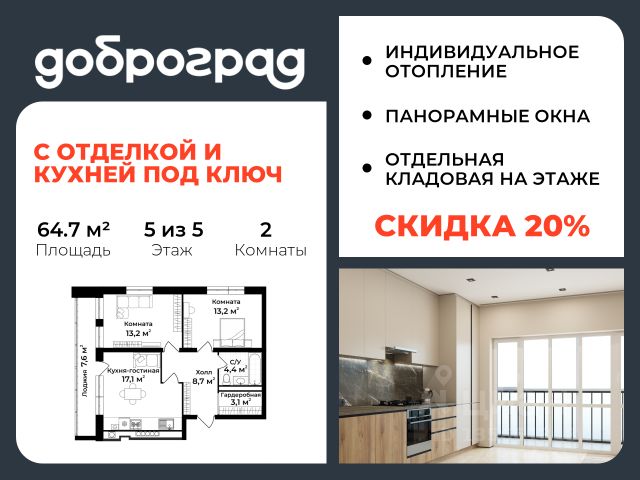 Продается 2-к квартира 64.70 кв.м. с полной ЧИСТОВОЙ ОТДЕЛКОЙ И КУХНЕЙ в новом уже построенном доме по адресу: Владимирская область, Доброград, улица Удачная, д.7 корп.3.brbrДом монолитно-блочный, в квартире предусмотрено индивидуальное отопление двухконтурным газовым котлом, что позволяет значительно экономить на комунальных платежах.brbrДОМ СДАН!brbrКвартира находится на 5 этаже 5-этажного дома. На лестничной площадке предусмотрена собственная кладовая комната (келлер) для хранения вещей. В доме есть лифт, просторные входные группы, организован безбарьерный вход в подъезд. Функциональная планировка, большая кухня-гостиная, эффектная лоджия с панорамным остеклением, гардеробная помогут грамотно организовать пространство. brbrОтделка квартиры включает в себя: br- пол - керамогранит/ламинат;br- стены - на кухне, в прихожей и в спальных комнатах - покраска, в санузле - керамогранит;br- натяжные потолки со встроенными светильниками и выводами для подвесных светильников;br- акриловая ванна, унитаз подвесной с инсталляцией, смесители, душевая система, подвесная раковина с тумбой, полотенцесушитель, вентилятор, вывод для стиральной машины;br- выключатели и розетки;br- кухонный гарнитур с врезной мойкой и смесителем, варочная панель, духовой шкаф встроенный, вытяжка встроенная, посудомоечная машина встроенная;br- вывод под кондиционер;br- межкомнатные двери;br- отделка лоджии.brbrРядом расположен живописный природный парк, озеро, места для отдыха и прогулок, качественные игровые площадки.brbrДоброград - это превосходная экология и современная инфраструктура всего в 2,5 часах от Москвы. В городе работает современный образовательный комплекс "МИР" (частная школа и детский сад), муниципальная гимназия. В 2026 году состоится открытие государственного детского сада и физкультурно-оздоровительного комплекса с бассейном. Медицинское обслуживание обеспечивает Первый клинический медицинский центр, расположенный в 12 километрах от Доброграда, а в самом Доброграде работает кабинет врача общей практики.Территория охраняется, въезд строго по пропускам, что гарантирует безопасность Вам и Вашей семье.brbrВ Доброграде организованы необходимые условия для занятий спортом круглый год:br- оборудованные площадки для самых популярных видов спорта,br- крытый спортивный комплекс,br- первое в регионе 9-луночное гольф-поле,br- скейт-парк,br- веревочный парк,br- освещенные лыжные и велосипедные трассы,br- крупнейший в Европе вейк-парк.brbrГород обслуживает собственная управляющая компания, которая обеспечивает бесперебойную работу всех систем, чистоту и порядок на территории.brКвартиру можно приобрести за наличную оплату, в ипотеку, а также с рассрочкой от застройщика. Условия ипотеки и рассрочки уточняйте у менеджеров отдела продаж.