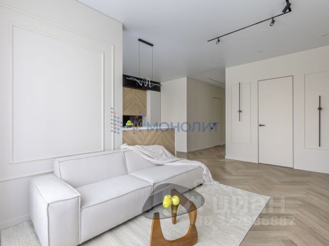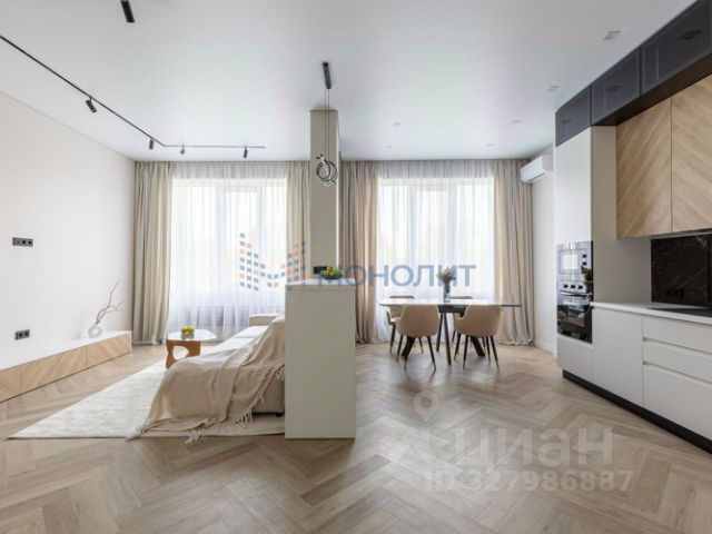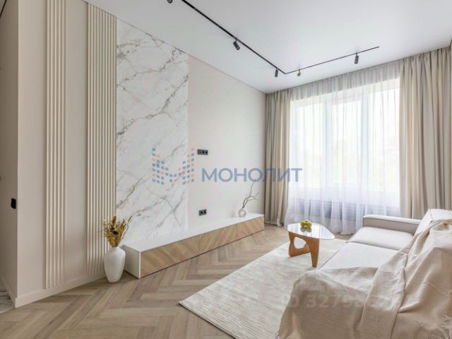 Удобная функциональная планировка, по сути евротрёшка: просторная кухня-гостиная с панорамой на Стрелку, практичная спальня плюс удобный кабинет, с видом на Оку, большая гардеробная, раздельный санузел.