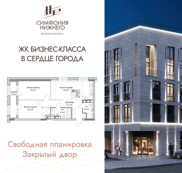 2-комн. квартира в ЖК "Симфония Нижнего" на 4 этаже. Квартира без отделки, полностью готова к ремонту. Общая площадь: 77.4 кв.м., жилая: 29.2 кв.м., площадь просторной кухни-столовой: 23.2 кв.м. Угловая квартира, идеально подойдет любителям тишины и панорамных видов. В квартире два совмещенных санузла. Высота потолков 3.0 м. Дом монолитный, трехподъездный, переменной этажности, от 7 до 9 этажей. Квартира находится в 1-й секции высотой 9 этажей в корпусе 2. На этаже 4 квартиры. В подъезде 1 пассажирский и 1 грузовой лифт. Окончание строительства - 4 квартал 2027 года. Оформление сделки по договору долевого участия. Продолжение застройки в историческом центре города - в границах улиц Ильинская и Новая. Локация с пешеходной доступностью к культурно-развлекательной, торговой, транспортной и социальной инфраструктуре. Вторая очередь жилого комплекса представлена двумя домами, имеющими интересное архитектурное решение. Например, дом 1 выглядит как несколько строений, объединенных общим основанием. Минимализм фасадов, благородные цвета, декоративная подсветка внешний облик определяет характер ЖК: современный, эстетичный, респектабельный. Вся территория продумана до мелочей: закрытый двор только для резидентов, ландшафтный дизайн, зоны отдыха. Здесь представлены квартиры свободной планировки без стен и перегородок, а значит вы сами создаете конфигурацию своего жилого пространства. Особое внимание эксклюзивным лотам: двухуровневые квартиры, квартиры с видом на историческую застройку и собственной террасой. Жители смогут управлять домашними системами со смартфона, а IP-домофоны будут оснащены функциями распознавания лиц и видеонаблюдения. Места общего пользования служат созданию настроения комфорта и уюта уже с входной группы. Холлы и подъезды выполнены по дизайн проекту и подчеркивают высокий статус дома. Для владельцев авто предусмотрен подземный паркинг, оснащенный доступом из лифта и местами для зарядки электромобилей. #Z6i6AD