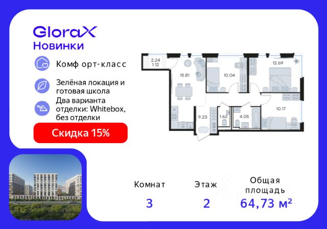 Продается 3-комн. квартира на 2-м этаже в строящемся проекте комфорт-класса GloraX Новинки. Общая площадь лота составляет 64,73 кв. м, из которых 32,90 кв. м отведено под жилую и 15,81 кв. м под кухонную зону. Номер квартиры - 318. Преимущества квартиры: компактная евро-4; угловая; лоджия; угловое остекление квартиры - Внедрение лучших практик строительства - Уникальное благоустройство, пешеходные аллеи и продуманные площадки (для релакса, спорта и игр с детьми) - Собственная коммерческая инфраструктура и комьюнити-центр для жителей - Безопасность на всех уровнях: закрытый двор, видеонаблюдение и система "Умный Дом" - Безбарьерная среда - Дизайнерские остекленные холлы - Просторные колясочные в каждой секции - Современные системы вентиляции, места для кондиционеров - Эргономичные квартиры с евро-планировками - Чистовая отделка квартир в 2 стилях на выбор и с дополнительной опцией покраски стен в 4 трендовых цвета на выбор: агатовый серый, серебристо-серый, серый шелк и тонкий лен. - Зеленая зона в шаговой доступности, заповедник регионального значения "Малиновая Гряда" и спортивная деревня Новинки GloraX Новинки - это современный масштабный проект в Нижнем Новгороде, который расположился у южной границы города по правому берегу Оки рядом с поселком Новинки в Приокском районе города. GloraX Новинки это проект с уникальным благоустройством, полной инфраструктурой для жизни и выгодными ценами на квартиры комфорт-класса. Близость к зеленым зонам реки, спортивной деревни Новинки и непосредственной черте города - идеальное место для тех кто любит природу, но не готов отказываться от благ современной инфраструктуры. GloraX Новинки надежно связан с другими районами Нижнего и популярными загородными направлениями такими как Павловское и Арзамасское направления, проспект Гагарина, а также ж/д станцией Окский берег и аэропортом Стригино. До главной парковой зоны города, парка "Швейцария" всего 15 минут на машине, а до Кремля и Чкаловской лестницы - 40 мин. В GloraX Новинки доступен широкий выбор планировочных решений от небольших уютных студий площадью 20 м2 до трехкомнатных квартир площадью до 72 м2 с просторными остекленными лоджиями. Получить ключи и сразу переехать? Легко! Все квартиры в проекте сдаются в чистовой отделке в двух стилях: в светлом и темном. Отдельной опцией можно даже дозаказать покраску стен в 4 трендовых цветах на выбор: агатовый серый, серебристо-серый, серый шелк и тонкий лен. Цена указана при 100% оплате или стандартной ипотеке. Узнайте подробности в Отделе продаж.