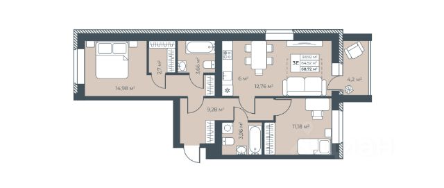 64.9 кв.м. + лоджия 7 кв.м.
