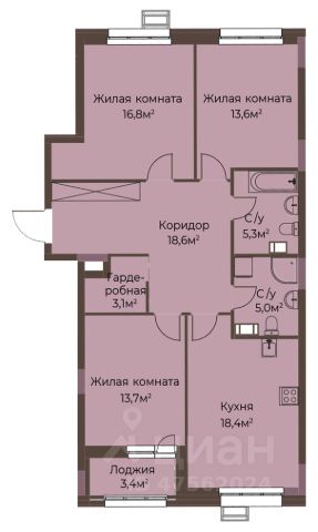 - просторная ГАРДЕРОБНАЯ комната (3,05 кв.м.), с встроенной системой хранения;