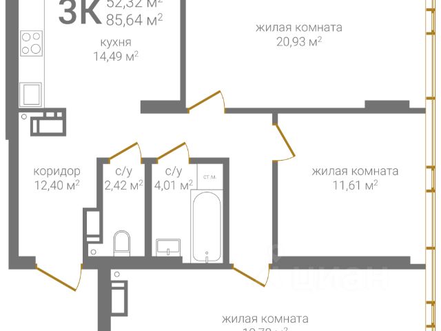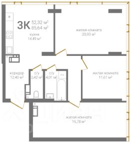 Площадь 63,9 кв.м, жилая 45 кв.м, кухня 9,5 кв.м просторная и светлая. Здесь легко разместить большой стол, собрать всю семью на ужин и начинать утро с ароматного кофе у окна.
