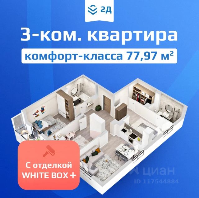Внимание! Открылись продажи квартир с потолками 3,3 м на 10 этаже. Сдача дома в 2026 г. Ипотека от 6%, трейд-ин, рассрочка, отсрочка платежа с первым взносом 0 р. Подробности в отделе продаж. Стоимость квартиры указана по акции "Новогодняя выгода до 1,2 млн руб.". Действует при покупке квартиры в ипотеку или при 100% оплате. Подробности в отделе продаж. В квартире будет выполнена качественная предчистовая отделка white box +. 3-комнатная квартира евроформата в жилом комплексе "2Д Федосеенко" (77,97 кв.м.). Просторная кухня-гостиная (20,6 кв.м.) с двумя окнами: благодаря этому в помещении будет много дневного света, и визуально оно будет казаться больше. Для родителей предусмотрена мастер-спальня: по функционалу это "квартира в квартире". Отдельный гардероб и санузел позволят собраться с утра на работу не выходя из комнаты. Все комнаты правильной формы. Удобно расставлять мебель, каждый квадратный метр задействован и работает с пользой. Семейный жилой комплекс 2Д Федосеенко представляет собой 10-этажный трехподъездный дом комфорт-класса с подземным паркингом. На первом этаже откроются кафе, магазины и другие объекты необходимой инфраструктуры. В приватном и безопасном дворе без машин будут расположены детские площадки, спортивная зона, уединенное пространство для отдыха взрослых. Разноуровневое освещение и комплексное озеленение подарит ощущение уюта и спокойствия. - Современная архитектура дома от проектной компании ГОРПРО; - Европланировки с мастер-спальнями, отдельными гардеробными, увеличенной площадью остекления; - Выводы радиаторов отопления из стены (удобно мыть пол, нет стояков около окон); - Дизайнерская отделка подъездов; - Высокие потолки: со 2 по 8 этаж - 2,7 м (от чистового пола до перекрытия потолка), на 9 и 10 этаже - 3,3 м (от чистового пола до перекрытия потолка); - Корзины для кондиционеров, чтобы сохранить статусный вид фасада; - Закрытая территория внутреннего двора "без машин" с системой контроля доступа и видеонаблюдением; - Детские площадки для разных возрастов; Поблизости есть все, что необходимо для комфортной жизни: школы 81, 93, детские сады 98, 211, остановка общественного транспорта "Достоевского", Сормовский парк, магазины продуктов, аптеки, пункты выдачи заказов крупнейших маркетплейсов. 3D-модель в изображениях представлена исключительно в ознакомительных целях. Изображённые отделка, мебель, техника, предметы интерьера, декора и иные элементы оформления квартиры являются иллюстрацией возможного интерьера и не входят в состав приобретаемой квартиры. Подробности в отделе продаж.