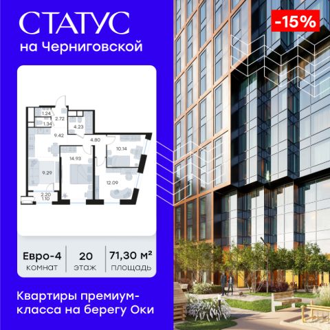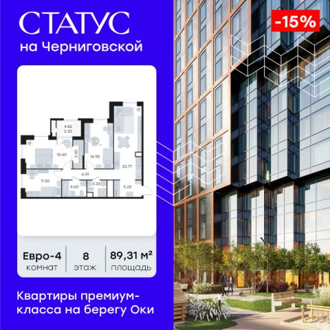 Продается 3-комн. квартира на 4-м этаже в строящемся проекте премиум-класса СТАТУС на Черниговской. Общая площадь лота составляет 88,82 кв. м, из которых 41,59 кв. м отведено под жилую и 22,53 кв. м под кухонную зону. Номер квартиры - 256. Преимущества квартиры: С лоджией - Квартиры премиум-класса у воды - Первая береговая линия. Изумительные виды на Стрелку и слияние Оки и Волги - Панорамные окна во всех квартирах - 11 минут до Кремля, 5 мин до Нижневолжской набережной - Дизайнерские лобби со вторым светом - Двухуровневый отапливаемый паркинг на 350 м\м - Приватный благоустроенный двор с видеонаблюдением только для резидентов - Современные детские площадки, зоны спокойного отдыха, зона для занятия спортом, зеленые кабинеты на свежем воздухе - Детские сады и школы в шаговой доступности - Собственный комьюнити-центр с коворкингом, детской комнатой, залом для фитнеса и кофе-поинтом. - Умный Дом и Умная Квартира - Ресторанный кластер в ЖК - Келлеры для хранения - Коммерческие помещения на 1 этаже СТАТУС на Черниговской - новый жилой комплекс премиум-класса в историческом центре Нижнего Новгорода, в котором объединились лаконичность архитектурной мысли, технологичность решений и внимание к деталям, присущее всем проектам компании GloraX. Проект для рационалистов, придающих большое внимание собственному комфорту и современным технологиям СТАТУС на Черниговской - это высшая форма Нижнего Новгорода. Инновационные решения и сервисы, закрытые дворы в стилобате с уютными детскими площадками, гастро-кластер, комьюнити-центр и дизайнерские лобби здесь все создано для максимального комфорта каждого жителя. Приватное пространство внутреннего двора с тактильными тропами, с собственным садами, камерными зелеными кабинетами для работы и отдыха, детскими площадками для разных возрастов и местами для занятия спортом создает неповторимую атмосферу безмятежности и спокойствия. СТАТУС на Черниговской возвращает набережной и пространству вокруг исторический статус, привлекая тех, кто готов развиваться вместе с городом. Дорога до любимейшего променада нижегородцев Нижне-Волжской набережной займет всего 10 минут пешком, до ближайшей станции метро Горьковская 10 минут на автомобиле. Попасть на главную площадь города, Чкаловскую лестницу и в Кремль на машине за 11 мин? Легко! И всего 48 минут займет путь до международного аэропорта имени Чкалова, что станет неоспоримым преимуществом для тех, кто часто летает в командировки. В проекте СТАТУС на Черниговской доступен широкий выбор планировочных решений от небольших уютных студий площадью 28,3 м2 до двухуровневых квартир с террасами площадью до 188,7 м2 и потрясающими видами на Нижегородские закаты. Все квартиры сдаются в черновой отделке, что позволяет нашим резидентам воплотить в своем доме любую дизайнерскую идею. Цена указана при 100% оплате или стандартной ипотеке. Узнайте подробности в Отделе продаж.