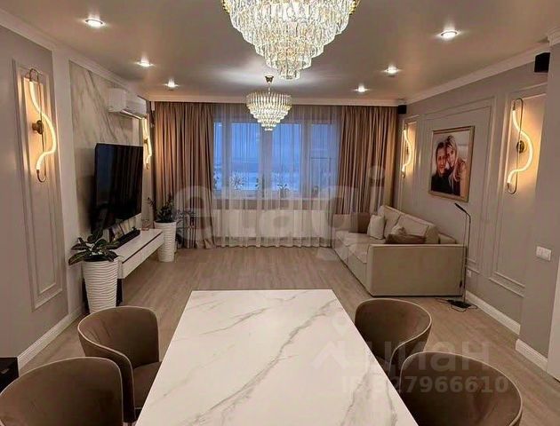Эта квартира идеально подходит для приема гостей и теплых семейных посиделок, ведь здесь есть просторная гостиная, объединенная с кухней идеальное пространство, созданное как раз для таких моментов!