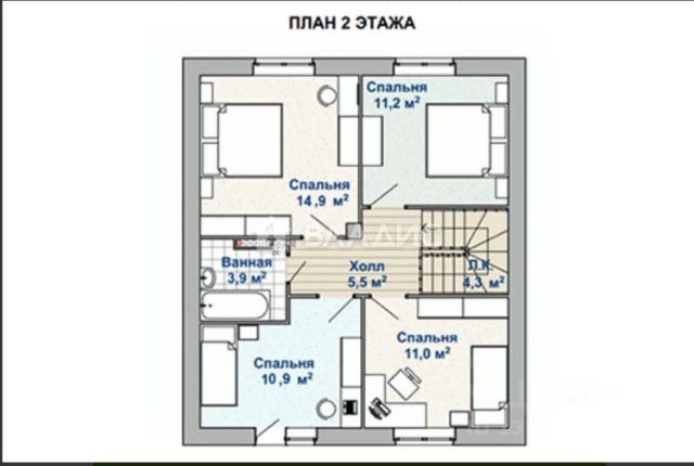 На втором этаже 2 комнаты по 14 метров с видами на разные стороны света, ванная комната.