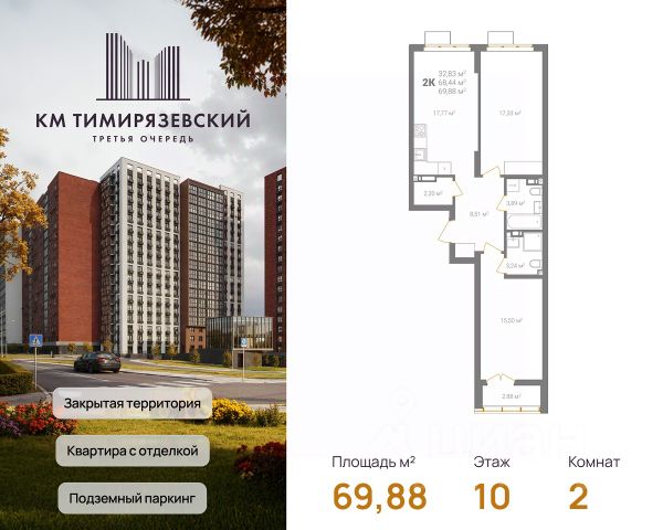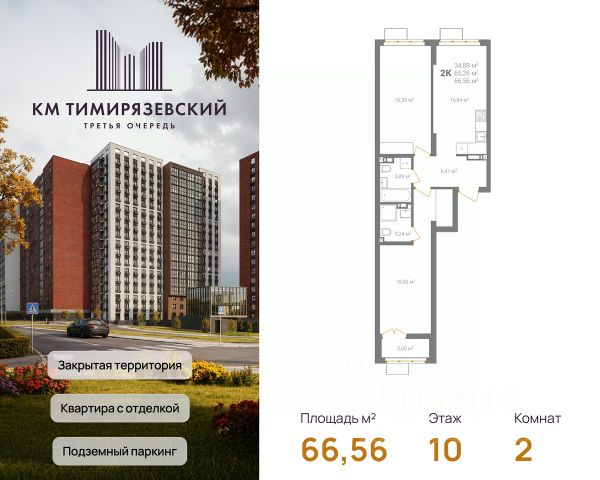 Продается квартира в 3 очереди строительства жилого комплекса КМ Тимирязевский. КМ Тимирязевский — современный жилой комплекс комфорт-класса в центре Нижнего Новгорода. Рядом улица Белинского, площадь Лядова, деловые кварталы и любимые места города. До Кремля — 10 минут, до Московского вокзала — 15. Квартира с отделкой "под ключ" На кухне установлен кухонный гарнитур с варочной поверхностью и духовым шкафом; В ванной — акриловая ванна, тропический и гигиенический души, зеркало, тумба с раковиной, стены и пол выложены крупноформатной плиткой; В каждой квартире предусмотрен шкаф в прихожей или система хранения в гардеробной. В каждой комнате поклеены обои, уложен ламинат 32 класса и белоснежный натяжной потолок. Преимущества комплекса: Фасады из керамического кирпича — надёжно и стильно Закрытый двор без машин — безопасность и уют Благоустройство продуманная территория для детей и взрослых Подземный паркинг — два уровня, лифт в жилую часть Коммерческие помещения на 1 этаже — магазины и сервисы рядом Все квартиры с готовой отделкой До 4 квартир в обособленном холле. КМ Тимирязевский. 3 очередь — ваш новый уровень комфорта. В домах третьей очереди действует программа от гк Каркас Монолит "КМ Капитал" — это стратегия, позволяющая использовать потенциал роста стоимости недвижимости максимально прозрачно и эффективно. Цена на квартиру формируется по заранее утверждённому графику, который не зависит от колебаний рынка. Это часть открытой ценовой политики группы компаний Каркас Монолит — вы точно знаете, когда и на сколько изменится стоимость, и можете планировать покупку как профессиональный инвестор. Вы можете видеть стоимость квартиры в конкретный период времени и заранее определить лучший момент для покупки или дальнейших инвестиционных решений.