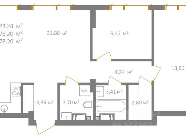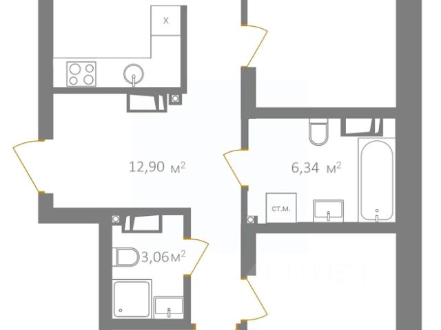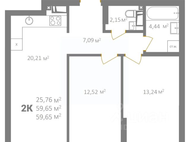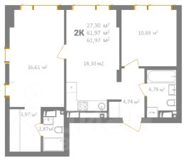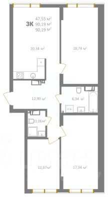 Квартира расположена на 15-м этаже - видовом этаже с окнами, выходящими на южную сторону. Общая площадь квартиры составляет 47,1 кв. м, из них жилая площадь - 18,4 кв. м, площадь кухни - 13 кв. м. Есть отдельная гардеробная или кладовка. Совмещённый санузел достаточно просторный - 6 кв. м. Планировка оптимальна для небольшой семьи, а метраж позволяет использовать квартиру как двухкомнатную.