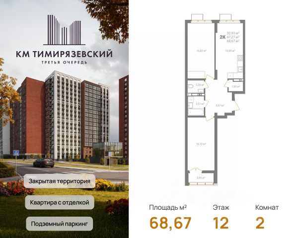 Кухня-гостиная 19.2м², комнаты 11.9, 11.5 и 10.5м², два санузла, тёплая лоджия, просторная прихожая с нишей под шкаф 2.8м. Высота потолков 2.75м.