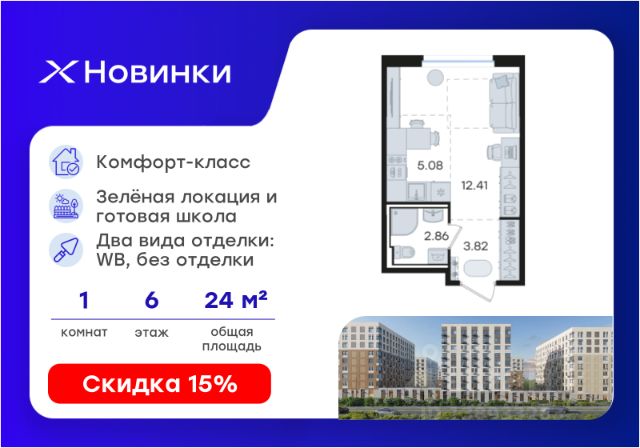 Продается 2-комн. квартира на 6-м этаже в строящемся проекте комфорт-класса Новинки. Общая площадь лота составляет 45,90 кв. м, из которых 21,84 кв. м отведено под жилую и 12,77 кв. м под кухонную зону. Номер квартиры - 670. Преимущества квартиры: угловая 2 к.кв.; лоджия - Внедрение лучших практик строительства - Уникальное благоустройство, пешеходные аллеи и продуманные площадки (для релакса, спорта и игр с детьми) - Собственная коммерческая инфраструктура и комьюнити-центр для жителей - Безопасность на всех уровнях: закрытый двор, видеонаблюдение и система "Умный Дом" - Безбарьерная среда - Дизайнерские остекленные холлы - Просторные колясочные в каждой секции - Современные системы вентиляции, места для кондиционеров - Эргономичные квартиры с евро-планировками - Чистовая отделка квартир в 2 стилях на выбор и с дополнительной опцией покраски стен в 4 трендовых цвета на выбор: агатовый серый, серебристо-серый, серый шелк и тонкий лен. - Зеленая зона в шаговой доступности, заповедник регионального значения "Малиновая Гряда" и спортивная деревня Новинки Новинки - это современный масштабный проект в Нижнем Новгороде, который расположился у южной границы города по правому берегу Оки рядом с поселком Новинки в Приокском районе города. Новинки - это проект с уникальным благоустройством, полной инфраструктурой для жизни и выгодными ценами на квартиры комфорт-класса. Близость к зеленым зонам реки, спортивной деревни Новинки и непосредственной черте города - идеальное место для тех кто любит природу, но не готов отказываться от благ современной инфраструктуры. Проект Новинки надежно связан с другими районами Нижнего и популярными загородными направлениями такими как Павловское и Арзамасское направления, проспект Гагарина, а также ж/д станцией Окский берег и аэропортом Стригино. До главной парковой зоны города, парка "Швейцария" всего 15 минут на машине, а до Кремля и Чкаловской лестницы - 40 мин. В проекте Новинки доступен широкий выбор планировочных решений от небольших уютных студий площадью 20 м2 до трехкомнатных квартир площадью до 72 м2 с просторными остекленными лоджиями. Получить ключи и сразу переехать? Легко! Все квартиры в проекте сдаются в чистовой отделке в двух стилях: в светлом и темном. Отдельной опцией можно даже дозаказать покраску стен в 4 трендовых цветах на выбор: агатовый серый, серебристо-серый, серый шелк и тонкий лен. Цена указана при 100% оплате или стандартной ипотеке. Узнайте подробности в Отделе продаж.