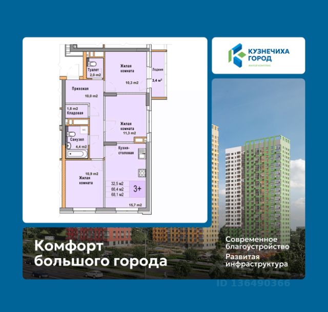 3-комн. квартира от застройщика с отделкой в ЖК "Кузнечиха город" на 6 этаже. Общая площадь: 76.5 кв.м., жилая: 39.8 кв.м., площадь просторной кухни-столовой: 18.2 кв.м. Квартира без проходных комнат, окна выходят нa три cтopoны дома. В квартире две лоджии, один совмещенный и один раздельный санузел. Высота потолков 2.5 м. Дом монолитный, трехподъездный, высотой 10 этажей. Квартира находится в 1-й секции в корпусе 7. На этаже 8 квартир. В подъезде 1 пассажирский и 1 грузовой лифт. Окончание строительства - 2 квартал 2028 года. Оформление сделки по договору долевого участия. "Кузнечиха Город" это современный семейный жилой комплекс расположенный в Советском районе в окружении парков и развитой инфраструктуры. Проект ориентирован на семейную аудиторию, поэтому особое внимание уделяется благоустройству и формированию соответствующей инфраструктуры. 1-ая очередь застройки включает в себя 12 кварталов, состоящих из 37 домов разной этажности. В 2024 году строительство первой очереди было завершено. На территории первой очереди ЖК работают 2 детских сада и школа, открыто более 100 объектов торговой инфраструктуры. 2-ая очередь застройки - это еще 16 домов по 10 и 25 этажей. По состоянию на октябрь 2025 г. в эксплуатацию введено 12 домов. Помимо жилых домов, здесь появится и развитая социальная, коммерческая, транспортная инфраструктура и благоустройство. На территории второй очереди уже работает школа, ведется подготовка к строительству детского сада на 320 мест. В 3-ей очереди застройки запланировано строительство 11 домов высотой 10, 18 и 25 этажей. Кроме строительства жилых домов, проект предусматривает создание развитой социальной, коммерческой и транспортной инфраструктуры. Ведется подготовка к строительству детского сада, рассчитанного на 220 мест. Все квартиры в ЖК передаются клиентам с чистовой отделкой класса "комфорт" В жилых комнатах, кухне и прихожей — обои нейтрального оттенка, белые межкомнатные двери без стекол. Пол в жилых комнатах — ламинат под дуб, в кухне и прихожей — плитка. Натяжные потолки во всех помещениях. Стены и пол в ванной и санузле будут отделаны керамогранитом, в ванной установлен полный комплект сантехники, включая акриловую ванну с экраном и смесителем, тумбу для хранения под раковиной, зеркало с подсветкой. Застройщик также позаботился и о деталях, поэтому все инженерные коммуникации, стояки водоснабжения и канализации будут скрыты декоративными коробами. #Zm87di
