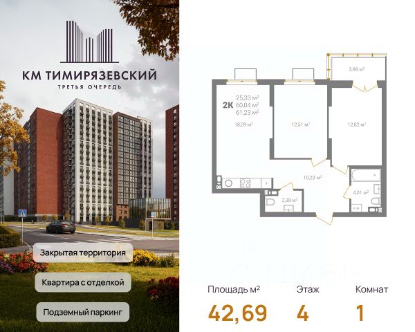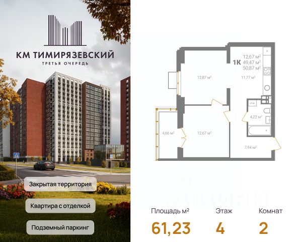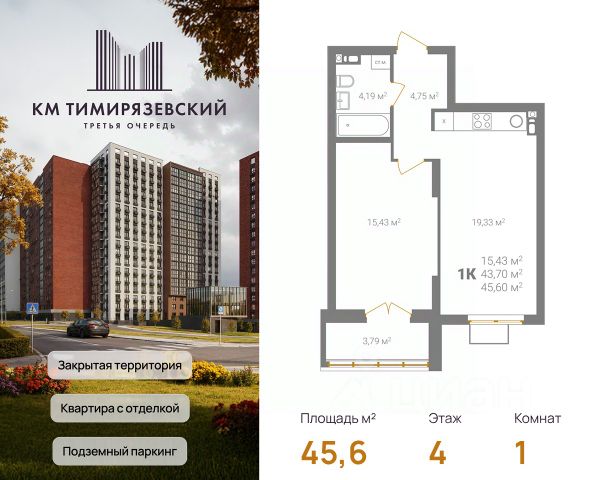 Продается квартира в 3 очереди строительства жилого комплекса КМ Тимирязевский. КМ Тимирязевский — современный жилой комплекс комфорт-класса в центре Нижнего Новгорода. Рядом улица Белинского, площадь Лядова, деловые кварталы и любимые места города. До Кремля — 10 минут, до Московского вокзала — 15. Квартира с отделкой "под ключ" На кухне установлен кухонный гарнитур с варочной поверхностью и духовым шкафом; В ванной — акриловая ванна, тропический и гигиенический души, зеркало, тумба с раковиной, стены и пол выложены крупноформатной плиткой; В каждой квартире предусмотрен шкаф в прихожей или система хранения в гардеробной. В каждой комнате поклеены обои, уложен ламинат 32 класса и белоснежный натяжной потолок. Преимущества комплекса: Фасады из керамического кирпича — надёжно и стильно Закрытый двор без машин — безопасность и уют Благоустройство продуманная территория для детей и взрослых Подземный паркинг — два уровня, лифт в жилую часть Коммерческие помещения на 1 этаже — магазины и сервисы рядом Все квартиры с готовой отделкой До 4 квартир в обособленном холле. КМ Тимирязевский. 3 очередь — ваш новый уровень комфорта. В домах третьей очереди действует программа от гк Каркас Монолит "КМ Капитал" — это стратегия, позволяющая использовать потенциал роста стоимости недвижимости максимально прозрачно и эффективно. Цена на квартиру формируется по заранее утверждённому графику, который не зависит от колебаний рынка. Это часть открытой ценовой политики группы компаний Каркас Монолит — вы точно знаете, когда и на сколько изменится стоимость, и можете планировать покупку как профессиональный инвестор. Вы можете видеть стоимость квартиры в конкретный период времени и заранее определить лучший момент для покупки или дальнейших инвестиционных решений.