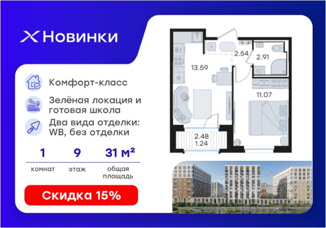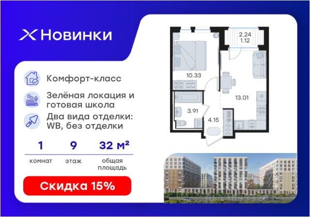 Продается квартира-студия на 9-м этаже в строящемся проекте комфорт-класса Новинки. Общая площадь лота составляет 24,15 кв. м, из которых 12,41 кв. м отведено под жилую и 5,00 кв. м под кухонную зону. Номер квартиры - 723. Преимущества квартиры: компактная студия; окна во двор - Внедрение лучших практик строительства - Уникальное благоустройство, пешеходные аллеи и продуманные площадки (для релакса, спорта и игр с детьми) - Собственная коммерческая инфраструктура и комьюнити-центр для жителей - Безопасность на всех уровнях: закрытый двор, видеонаблюдение и система "Умный Дом" - Безбарьерная среда - Дизайнерские остекленные холлы - Просторные колясочные в каждой секции - Современные системы вентиляции, места для кондиционеров - Эргономичные квартиры с евро-планировками - Чистовая отделка квартир в 2 стилях на выбор и с дополнительной опцией покраски стен в 4 трендовых цвета на выбор: агатовый серый, серебристо-серый, серый шелк и тонкий лен. - Зеленая зона в шаговой доступности, заповедник регионального значения "Малиновая Гряда" и спортивная деревня Новинки Новинки - это современный масштабный проект в Нижнем Новгороде, который расположился у южной границы города по правому берегу Оки рядом с поселком Новинки в Приокском районе города. Новинки - это проект с уникальным благоустройством, полной инфраструктурой для жизни и выгодными ценами на квартиры комфорт-класса. Близость к зеленым зонам реки, спортивной деревни Новинки и непосредственной черте города - идеальное место для тех кто любит природу, но не готов отказываться от благ современной инфраструктуры. Проект Новинки надежно связан с другими районами Нижнего и популярными загородными направлениями такими как Павловское и Арзамасское направления, проспект Гагарина, а также ж/д станцией Окский берег и аэропортом Стригино. До главной парковой зоны города, парка "Швейцария" всего 15 минут на машине, а до Кремля и Чкаловской лестницы - 40 мин. В проекте Новинки доступен широкий выбор планировочных решений от небольших уютных студий площадью 20 м2 до трехкомнатных квартир площадью до 72 м2 с просторными остекленными лоджиями. Получить ключи и сразу переехать? Легко! Все квартиры в проекте сдаются в чистовой отделке в двух стилях: в светлом и темном. Отдельной опцией можно даже дозаказать покраску стен в 4 трендовых цветах на выбор: агатовый серый, серебристо-серый, серый шелк и тонкий лен. Цена указана при 100% оплате или стандартной ипотеке. Узнайте подробности в Отделе продаж.