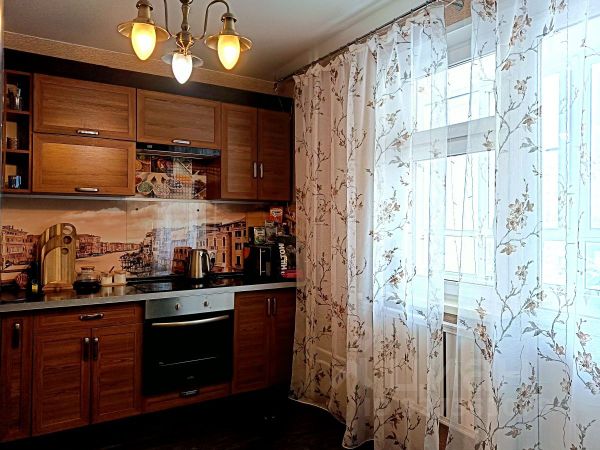 Сразу замечаешь, что из четырех стен, образующих первое жилое пространство, две выложены старинной кирпичной кладкой, и две стены обложены деревянными и металлическими индивидуальными панелями, скрывающими двери в другие помещения и секретные дверцы разнообразных систем хранения и кухонных модулей. Внутренняя входная дверь (выполняющая роль не только дизайнерской находки, но и дополнительного блока шумопонижения) выглядит как сомкнутые створки советского лифта. Брутальная барная столешница из массива дуба укреплена на основательной трубе с кольцевыми фланцами. Сверху здесь и в некоторых других местах видны металлические трубки с фитингами, являющиеся частью индивидуальных светильников и элементов функционального декора. Элементы из металла не могут не привлекать внимания: натянутые по вертикали цепи в качестве зонирующего элемента, ручки на скользящих панелях дверей из фрагментов таких же цепей; цилиндрическая вытяжка-"трансформер" на пульте управления, выглядящая одновременно и как "мобиль", и как предмет кинематографической космической станции; торшер и прикроватные дизайнерские лампы; шляпки гвоздей кожаной обивки дивана. Спинки барных табуретов, дверцы холодильника, рифленая поверхность алюминиевого листа, полностью "драпирующего" вертикальную коммунальную стойку, металлическая сетка на потолке и даже фасадные элементы кухни весь этот "промдизайн" воспринимается как "черта характера" данного помещения.