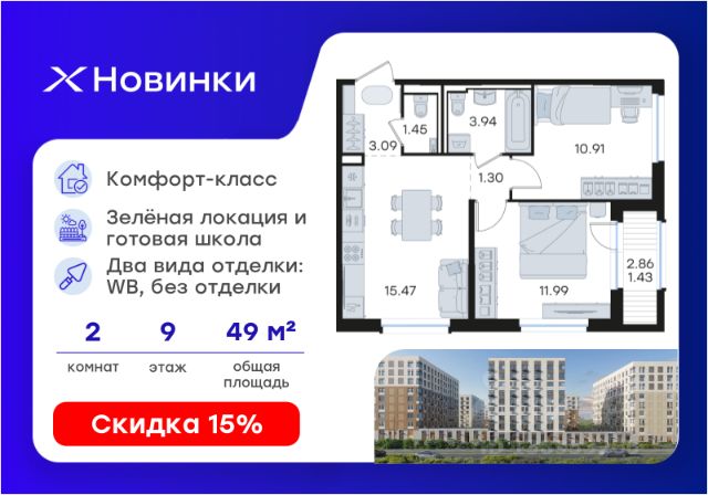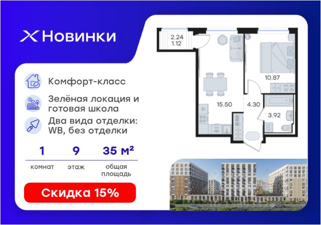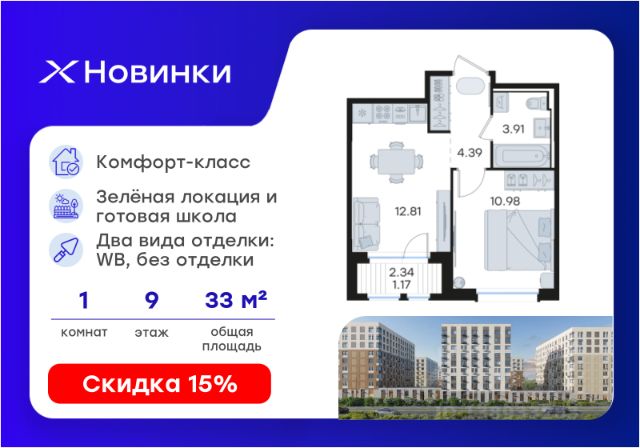 Продается квартира-студия на 9-м этаже в строящемся проекте комфорт-класса Новинки. Общая площадь лота составляет 24,19 кв. м, из которых 12,45 кв. м отведено под жилую и 4,99 кв. м под кухонную зону. Номер квартиры - 722. Преимущества квартиры: компактная студия; окна во двор - Внедрение лучших практик строительства - Уникальное благоустройство, пешеходные аллеи и продуманные площадки (для релакса, спорта и игр с детьми) - Собственная коммерческая инфраструктура и комьюнити-центр для жителей - Безопасность на всех уровнях: закрытый двор, видеонаблюдение и система "Умный Дом" - Безбарьерная среда - Дизайнерские остекленные холлы - Просторные колясочные в каждой секции - Современные системы вентиляции, места для кондиционеров - Эргономичные квартиры с евро-планировками - Чистовая отделка квартир в 2 стилях на выбор и с дополнительной опцией покраски стен в 4 трендовых цвета на выбор: агатовый серый, серебристо-серый, серый шелк и тонкий лен. - Зеленая зона в шаговой доступности, заповедник регионального значения "Малиновая Гряда" и спортивная деревня Новинки Новинки - это современный масштабный проект в Нижнем Новгороде, который расположился у южной границы города по правому берегу Оки рядом с поселком Новинки в Приокском районе города. Новинки - это проект с уникальным благоустройством, полной инфраструктурой для жизни и выгодными ценами на квартиры комфорт-класса. Близость к зеленым зонам реки, спортивной деревни Новинки и непосредственной черте города - идеальное место для тех кто любит природу, но не готов отказываться от благ современной инфраструктуры. Проект Новинки надежно связан с другими районами Нижнего и популярными загородными направлениями такими как Павловское и Арзамасское направления, проспект Гагарина, а также ж/д станцией Окский берег и аэропортом Стригино. До главной парковой зоны города, парка "Швейцария" всего 15 минут на машине, а до Кремля и Чкаловской лестницы - 40 мин. В проекте Новинки доступен широкий выбор планировочных решений от небольших уютных студий площадью 20 м2 до трехкомнатных квартир площадью до 72 м2 с просторными остекленными лоджиями. Получить ключи и сразу переехать? Легко! Все квартиры в проекте сдаются в чистовой отделке в двух стилях: в светлом и темном. Отдельной опцией можно даже дозаказать покраску стен в 4 трендовых цветах на выбор: агатовый серый, серебристо-серый, серый шелк и тонкий лен. Цена указана при 100% оплате или стандартной ипотеке. Узнайте подробности в Отделе продаж.