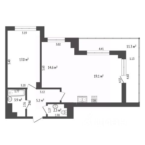 Площадь квартиры с учетом площади лоджий - 57,9 м2.