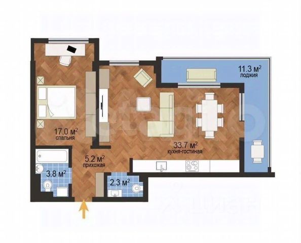 Квартира евроформата, где имеются 2 спальни и просторная гостевая зона с кухней.