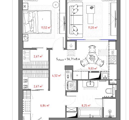 Готовая квартира от застройщика. Функциональная однушка в центре города для ценящих комфорт: большая комната 18.65 м², кухня-гостиная 7.8 м², раздельные санузел и ванная, гардеробная, просторный балкон. Квартира в черновой отделке