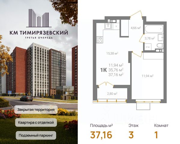 Продается квартира в 3 очереди строительства жилого комплекса КМ Тимирязевский. КМ Тимирязевский — современный жилой комплекс комфорт-класса в центре Нижнего Новгорода. Рядом улица Белинского, площадь Лядова, деловые кварталы и любимые места города. До Кремля — 10 минут, до Московского вокзала — 15. Квартира с отделкой "под ключ" На кухне установлен кухонный гарнитур с варочной поверхностью и духовым шкафом; В ванной — акриловая ванна, тропический и гигиенический души, зеркало, тумба с раковиной, стены и пол выложены крупноформатной плиткой; В каждой квартире предусмотрен шкаф в прихожей или система хранения в гардеробной. В каждой комнате поклеены обои, уложен ламинат 32 класса и белоснежный натяжной потолок. Преимущества комплекса: Фасады из керамического кирпича — надёжно и стильно Закрытый двор без машин — безопасность и уют Благоустройство продуманная территория для детей и взрослых Подземный паркинг — два уровня, лифт в жилую часть Коммерческие помещения на 1 этаже — магазины и сервисы рядом Все квартиры с готовой отделкой До 4 квартир в обособленном холле. КМ Тимирязевский. 3 очередь — ваш новый уровень комфорта. В домах третьей очереди действует программа от гк Каркас Монолит "КМ Капитал" — это стратегия, позволяющая использовать потенциал роста стоимости недвижимости максимально прозрачно и эффективно. Цена на квартиру формируется по заранее утверждённому графику, который не зависит от колебаний рынка. Это часть открытой ценовой политики группы компаний Каркас Монолит — вы точно знаете, когда и на сколько изменится стоимость, и можете планировать покупку как профессиональный инвестор. Вы можете видеть стоимость квартиры в конкретный период времени и заранее определить лучший момент для покупки или дальнейших инвестиционных решений.