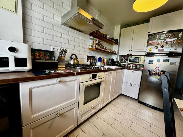 На кухне удобный гарнитур, где есть место для духового шкафа, микроволновки, телевизора, муз.центра, с отличной 5-тиконфорочной плитой, вытяжкой, качественной газовой колонкой (горячая вода круглый год!), есть кондиционер.