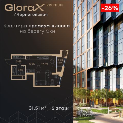 Продается квартира-студия на 4-м этаже в строящемся проекте премиум-класса GloraX Premium Черниговская. Общая площадь лота составляет 31,47 кв. м, из которых 17,05 кв. м отведено под жилую и 5,95 кв. м под кухонную зону. Номер квартиры - 15. Преимущества квартиры: - Квартиры премиум-класса у воды - Первая береговая линия. Изумительные виды на Стрелку и слияние Оки и Волги - Панорамные окна во всех квартирах - 11 минут до Кремля, 5 мин до Нижневолжской набережной - Дизайнерские лобби со вторым светом - Двухуровневый отапливаемый паркинг на 350 м\м - Приватный благоустроенный двор с видеонаблюдением только для резидентов - Современные детские площадки, зоны спокойного отдыха, зона для занятия спортом, зеленые кабинеты на свежем воздухе - Детские сады и школы в шаговой доступности - Собственный комьюнити-центр с коворкингом, детской комнатой, залом для фитнеса и кофе-поинтом. - Умный Дом и Умная Квартира - Ресторанный кластер в ЖК - Келлеры для хранения - Коммерческие помещения на 1 этаже GloraX Premium Черниговская - новый жилой комплекс премиум класса в историческом центре Нижнего Новгорода, в котором объединились лаконичность архитектурной мысли, технологичность решений и внимание к деталям, присущее всем проектам компании GloraX. Проект для рационалистов, придающих большое внимание собственному комфорту и современным технологиям GloraX Premium Черниговская это высшая форма Нижнего Новгорода. Инновационные решения и сервисы, закрытые дворы в стилобате с уютными детскими площадками, гастро-кластер, комьюнити-центр и дизайнерские лобби здесь все создано для максимального комфорта каждого жителя. Приватное пространство внутреннего двора с тактильными тропами, с собственным садами, камерными зелеными кабинетами для работы и отдыха, детскими площадками для разных возрастов и местами для занятия спортом создает неповторимую атмосферу безмятежности и спокойствия. GloraX Premium Черниговская возвращает набережной и пространству вокруг исторический статус, привлекая тех, кто готов развиваться вместе с городом. Дорога до любимейшего променада нижегородцев Нижневолжской набережной займет всего 10 минут пешком, до ближайшей станции метро Горьковская 10 минут на автомобиле. Попасть на главную площадь города, Чкаловскую лестницу и в Кремль на машине за 11 мин? Легко! И всего 48 минут займет путь до международного аэропорта имени Чкалова, что станет неоспоримым преимуществом для тех, кто часто летает в командировки. В GloraX Premium Черниговская доступен широкий выбор планировочных решений от небольших уютных студий площадью 28,3 м2 до двухуровневых квартир с террасами площадью до 188,7 м2 и потрясающими видами на Нижегородские закаты. Получить ключи и сразу переехать? Легко! Мы подготовили для вас чистовую отделку в двух стилях: в эко- минималистичном светлом и своременно-модернистском темном. Отдельной опцией можно даже дозаказать покраску стен в 4 трендовых цветах на выбор: агатовый серый, серебристо-серый, серый шелк и тонкий лен. Цена указана Продам квартиру-студию 30 м2 (квадратных метров) в Нижегородской области.