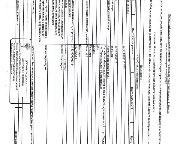 Данные получены с сайта ГИС Торги. Квартира (жилое) общей площадью 43,7 кв.м, этаж 2, кол-во зарегистрированных 2 человека, кадастровый (или условный) номер 52:33:0000015:235. Адрес: Нижегородская обл., г. Павлово, ул. 1-я Строителя, д. 36, кв. 38. Должник Ануфриева Я.В.