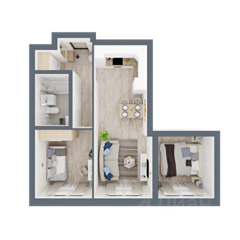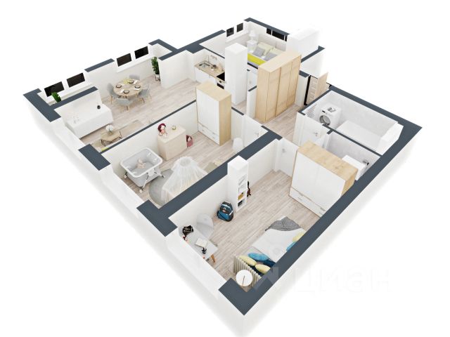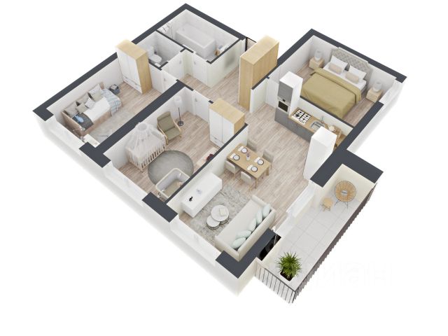 Общая площадь квартиры 91 м² (с коэффициентом лоджий 0,5м2). Эргономичная планировка для большой семьи: три изолированные спальни (21.3 м2, 11.9 м2, 11 м2), просторная кухня-гостиная (27.1 м2), два совмещённых санузла. Из прихожей организована гардеробная для организации хранения вещей. Угловая большая спальная комната с двумя окнами наполнена светом, панорамное остекление и вид на реку и закат. Увеличенный оконные проемы создают ощущение воздуха и комфорта во всей квартире. Из всех комнат завораживающий вид на реку.