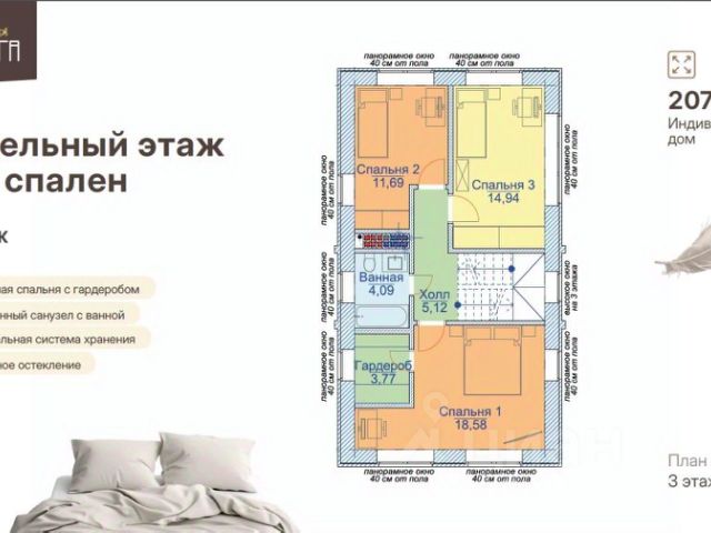 Третий этаж две гостевые комнаты, которые можно легко переоборудовать в личный кабинет или детские, отдельная гардеробная и ванная комната.