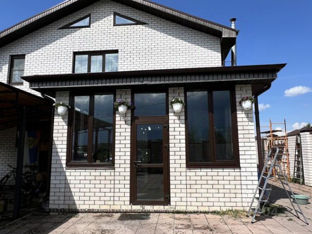 * дом из бруса, на фундаменте с кирпичным цоколем, снаружи обшит светлым сайдингом,