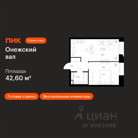 1-комн.кв. · 42,3 м² · 2/22 этаж